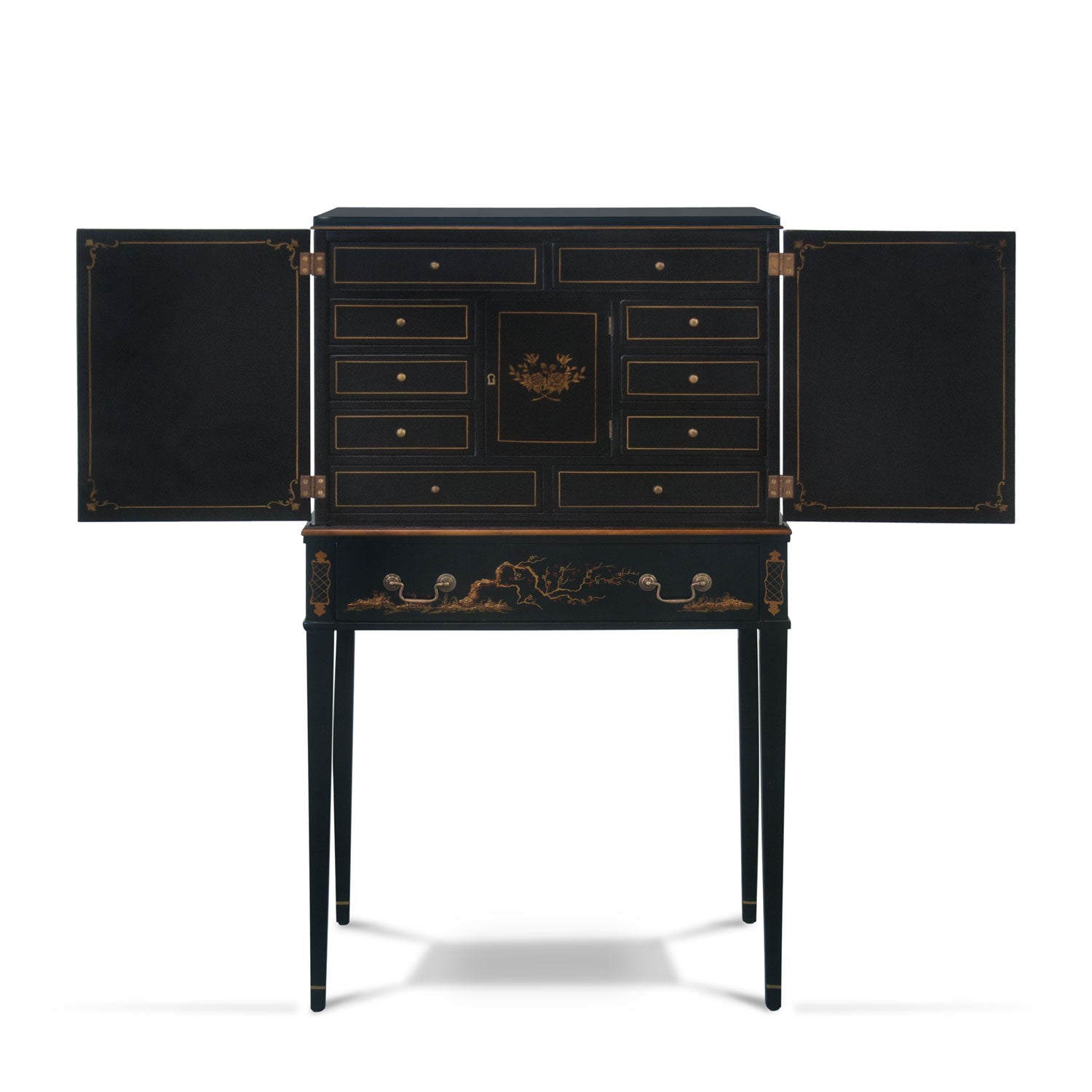 Adorning the cabinet are intricate Chinoiserie motifs in warm gold and reddish tones, lending the piece a sense of artistry, heritage and sophistication. At the centre, two upper doors meet beneath a circular decorative metal lock plate, while stylised flowering branches sweep elegantly across the front, enhancing its ornamental charm.